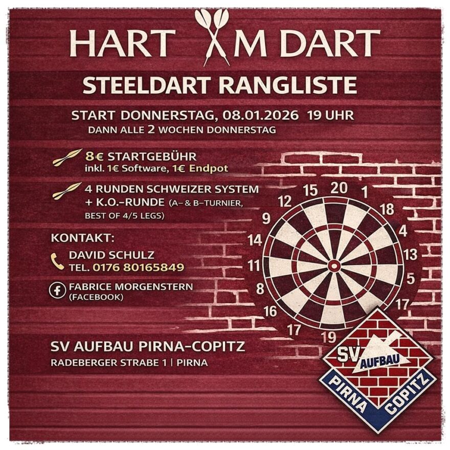 Das erste Ranglistenturnier von „Hart am Dart“ steht an. Wer noch nicht auf der Liste steht, sollte den Wurfarm kurz ruhen lassen und sich fix anmelden.