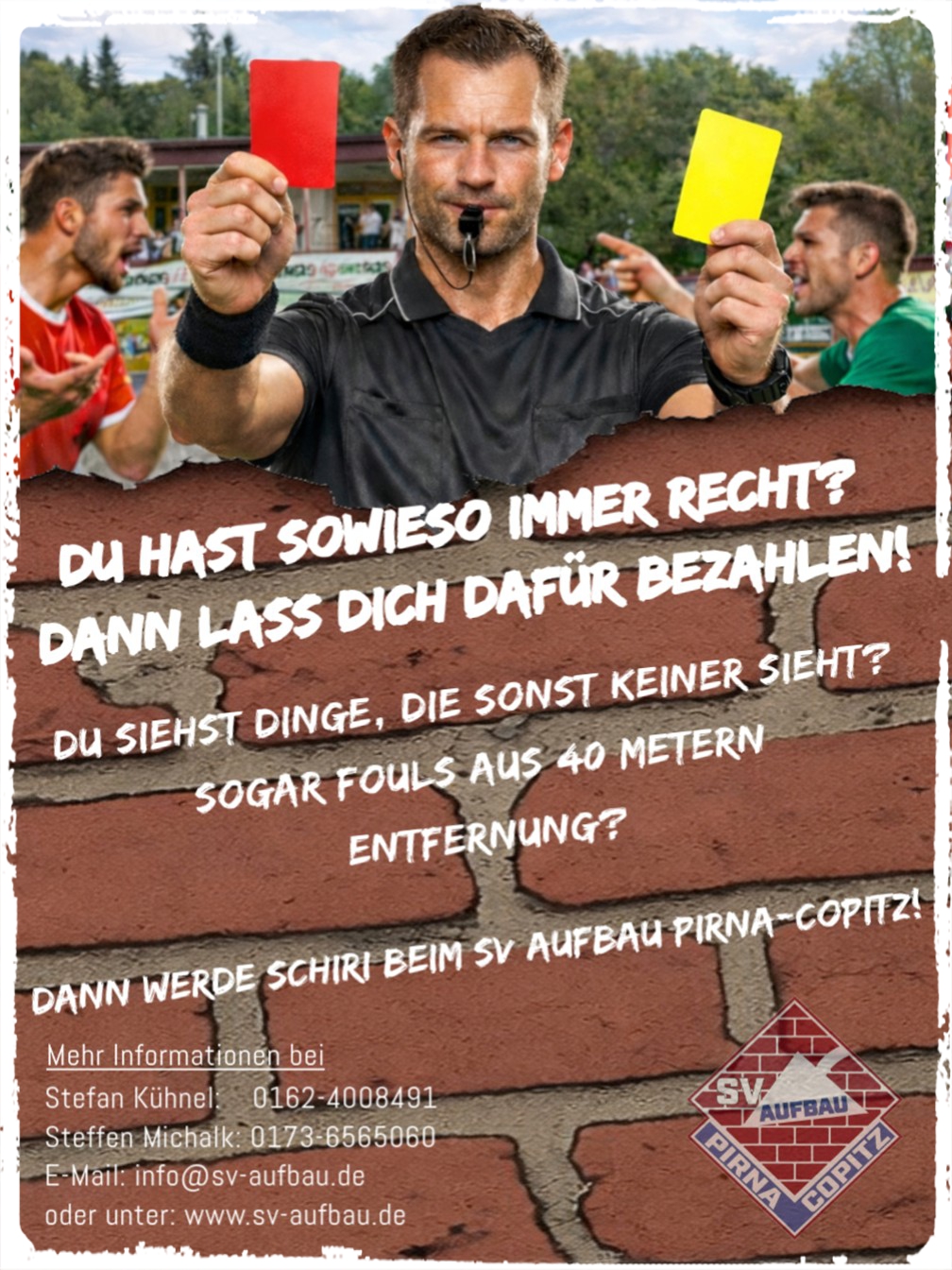 Wir beim SV Aufbau suchen genau DICH! Du bist entscheidungsfreudig, bleibst auch in hitzigen Momenten cool und möchtest Teil unserer Fußballfamilie werden? Dann haben wir das perfekte Angebot für dich: